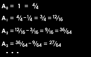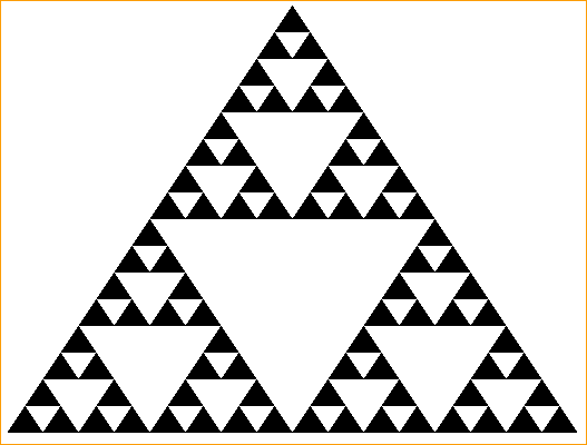 Create an inner triangle by connecting the mid-points of the original triangle's sides, and remove the inner triangle's interior. Do the same to each of the 3 remaining triangles, removing their inner triangles' interiors. Do the same to each of the 9 remaining triangles, removing their inner triangles' interiors. Continue this process. |