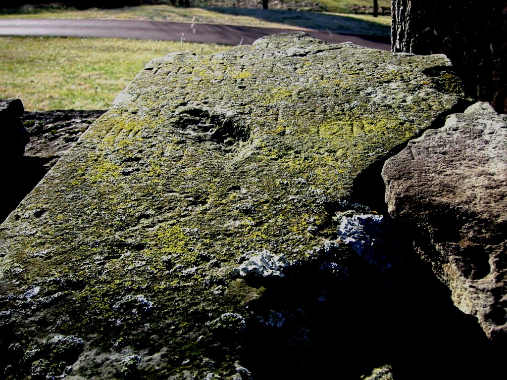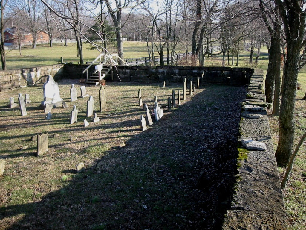 | Leah (Hughes) McKown's tombstone, (closeup, r) rests on the wall of the Tyler family cemetery, Jeffersontown, KY. "In Memory of Leah McKonn consort of Robt McKonn who departed this life Apr. 12th 1822 aged 68 years." (hard to read; 88 years would fit her life story better...) |