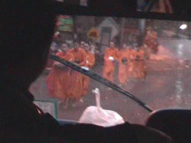 The temple of Doi Suthep ("doi" means "mountain") is located high on a hill. The majority of the route is a winding uphill journey. During our journey to Doi Suthep, we encountered many monks walking along the road. From our tour guide, we knew that there was also a temple nearby, and every morning, they will go out for food.