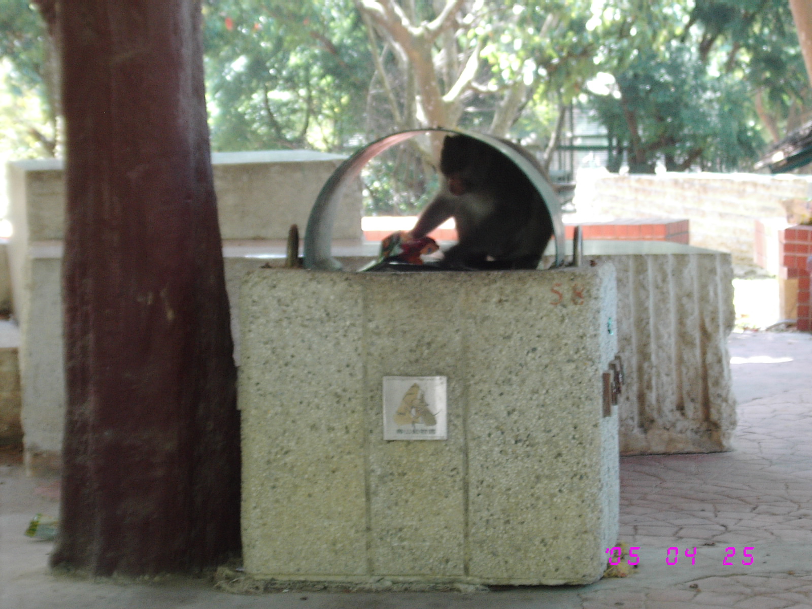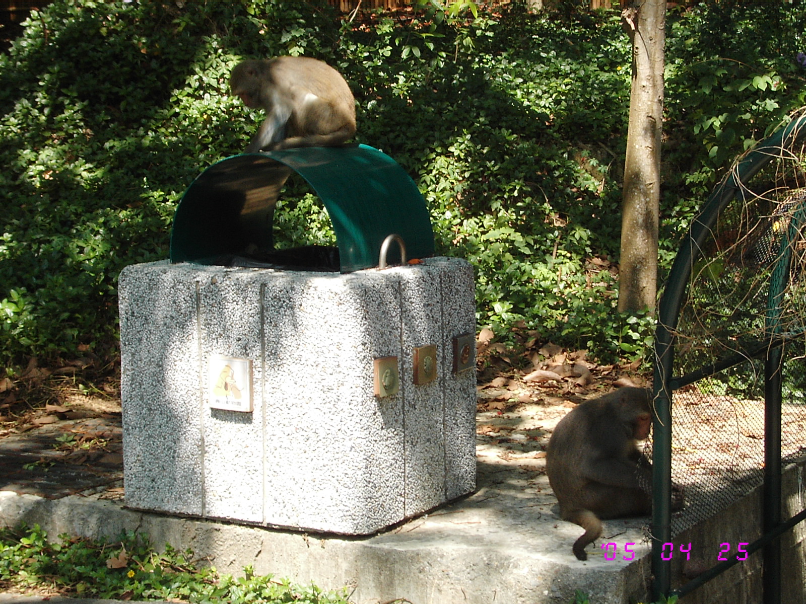 上圖:獼猴在垃圾桶理撈了很久還是找不到食物,大概是來的太早了,遊客還沒丟太多垃圾
