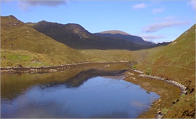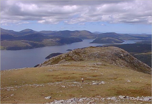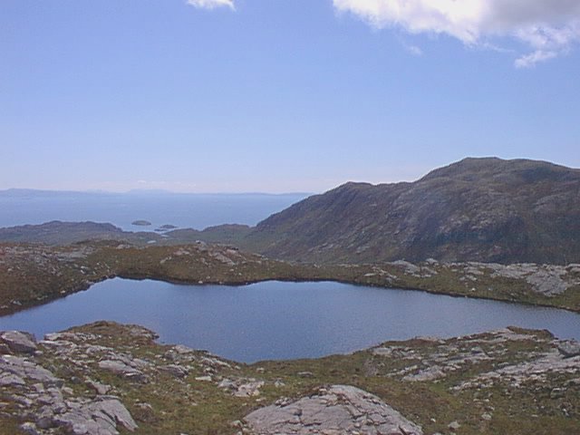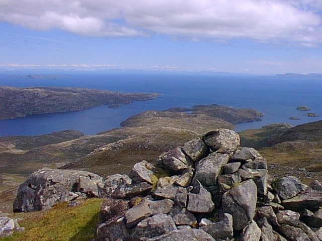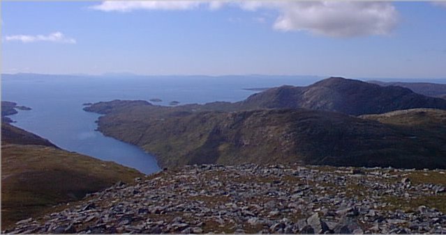 A good track, not hinted at on the OS map, runs west from Eishken to the good bridge at the head of Loch Sealg [picture 1]. It continues into the valley east of Beinn Mhor, where it terminates abruptly at a weather vane. This totally unexpected feature in an otherwise empty landscape carries a weatherfish rather than a weathercock. From here we worked our way up onto the south-east ridge of Beinn Mhor which at 572m is the highest hill in this area, the Pairc peninsula. From the stony summit we got our first glimpse of distant Caiteshal [picture 2] and a splendid panorama westwards to Sgaoth Aird and Clisham, the highest mountain in the Western Isles [picture 3]. The south-west ridge gave very easy walking to Carn Ban whose cairn was unexpectedly surrounded by dozens of old car tyres. Then a steep descent took us onto the ridge of Cipeagil Bheag which is actually higher than nearby Cipeagil Mhor and is in the Marilyn list. Its summit is a area of rock and rock pools, a very pleasant spot for lunch on this warm and sunny day. From this top we looked back to Beinn Mhor [picture 4] and forward to our next and furthest summit [picture 5].