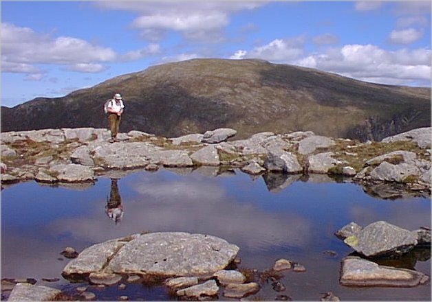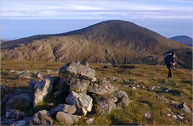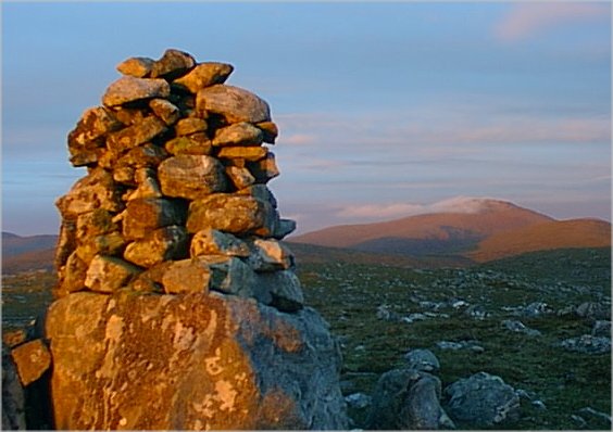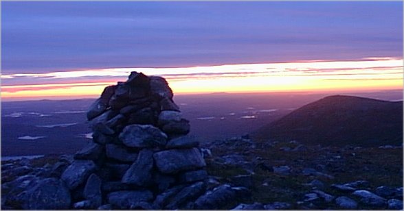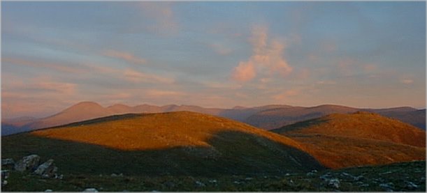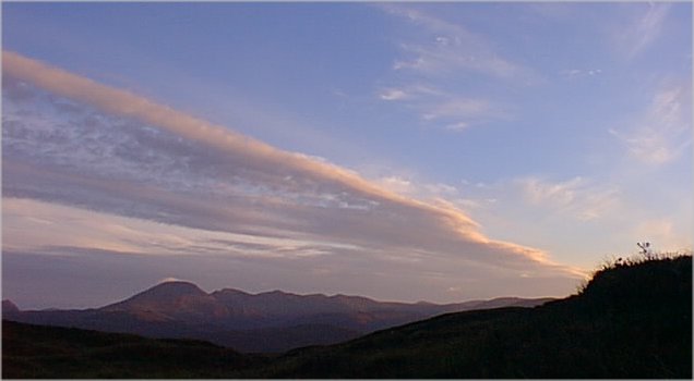 At last we dragged ourselves away from this delectable spot and retreated along the north ridge. Then began a long traverse around the west side of Beinn Mhor. Even in this perfect clear weather it was not easy to keep on the best contour to avoid both unnecessary reascent and the deep clefts of streams running down the hillside. These streams were not to be avoided altogether though, since they provided welcome water on what was now a very hot afternoon. It was quite late when we reached the col to the north of Beinn Mhor where a decision had to be made. If we now went straight down the valley to Loch Sealg we reckoned that we would reach the good track by dusk. However it was a beautiful evening and we had carried the bivi bags all day so we decided to continue onto Muiaithabhal and spend the night in the hills [picture 8]. On the col north of Muaithabhal an unpleasant cold wind had sprung up and it was difficult to find a flat and sheltered spot to settle down for the night. We lay huddled in the bivi bags watching the sun set behind Clisham [picture 9]. By 3am we were awake, cold and anxious to get moving. The climb onto Guainemol brought welcome warming and from the cairn we saw a multitude of lochans catching the first glimmers of light from the sun which was still below the eastern horizon [picture 10]. By the time we had walked to the cairn on Mor Mhonadh it was bathed in early morning sunlight with Beinn Mhor wreathed in a wisp of cloud [picture11]. The ridge we had just followed was backed by Clisham, already in bright daylight [picture12]. By the time we had descended into the exceedingly boogy valley of the Abhainn Sgeiraval and walked back on the quiet road to the car, it had turned into a gloomy morning with spitting rain. We reckoned ourselves lucky indeed to have completed this exceptional walk in such superb weather.