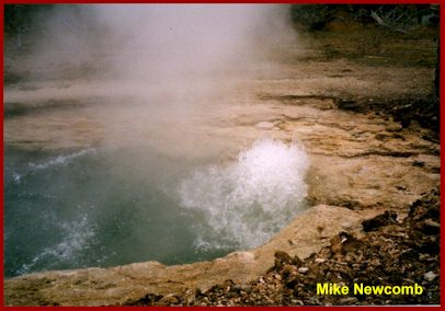 | The two pictures by Michael Frazier show Norris Pool as it looked on October 4, 1998. This was its first day of geyser activity since it had reappeared in 1995 as a mudpot. As the geyser activity continued, the crater was enlarged and the water cleared. The bottom picture shows Norris Pool pretty much as it looked two days earlier. |