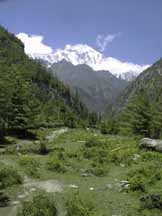 We soon got into a routine of waking early, downing a quick breakfast, and hitting the trail. Besides lunch, we often took tea breaks at many of the small villages along the way. As we moved northwards up the valley, the vegetation and even the villages changed character. Steep and windy trails would give way to spectacular vistas; booming tourist towns would alternate with small local villages, complete with the local species of rugrat. Often towns had mani walls in the middle of their main street. These are walls piled with stones, with prayers carved into each one. Often these are accompanied by prayer wheels. These, as well as the ubiquitous prayer flags, are traditional Tibetan buddhist. It is believed that by turning the wheels (or flapping the flags) the prayers written on them are released to the wind, and thus to the gods.