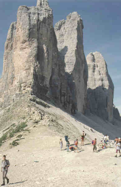 Els tres grans cims del Lavaredo. Al central (Cima grande ) es pot distingir l'aresta Divona (itinerari de baixa dificultat i gran recorregut).