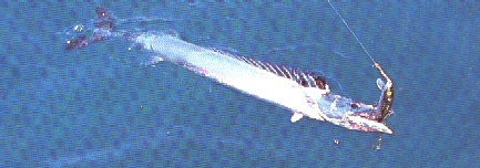 The Barracouta description is: it is a nice slim fish with needle sharp teeth, it is usally dark steely-blue colour or a dark green along the top of the back. It's body is a nice and shiny silver colour, and on the top dorsal fin, it has a run of black on it.