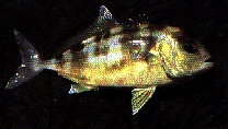 The Samson Fish is a medium to large fish, which is a deep-bodied predatory fish, distinguished from the Amberjack by the number of fin rays and gill rakers. The Samson has 23-25 soft rays in it's second dorsal. The colouration of the Samson fish is variable. Adults are blue-green to greeny-gold or bronze on the back, paler on the flanks. Younger fish are reddish-bronze on the back, with fairly distinct vertical blotches and bars of dark brown or black on the back and upper flanks. The fins are reddish-yellow or dusky.