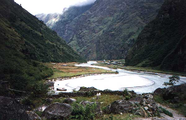 Sange to Tal, Manang 1675 metres Walked to Jagat at 1314 metres, uphill for an hour, and on to cross the river again (another suspension bridge) to Chamje for lunch. Walked into a different environment to-day. Left the rice fields behind. A lot of climbing, going down to the river and climbing back up again. The valley has narrowed, more rock in the mountains. Some corn grown on the sides of the mountains.