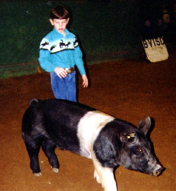 My youngest son showing his pig,"Squealer" in the county livestock show