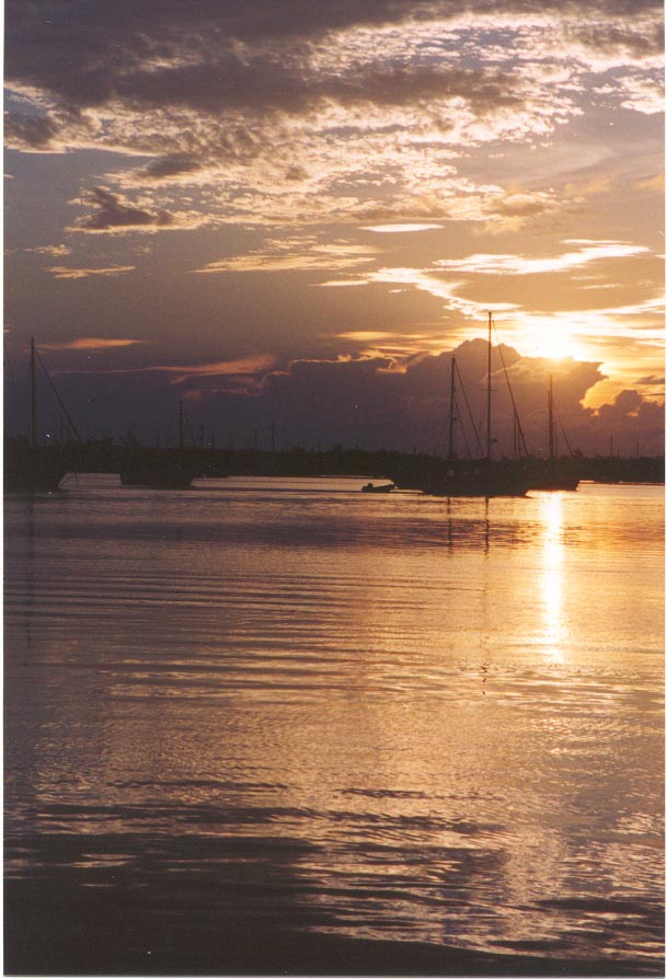 Long Key to the Marquesas Keys My base of operations in the Keys has been Sea Bird Marina on Long Key (mile marker 69.5 Bay Side). This is next to the Channel 5 bridge and just off the intercoastal waterway so sailors have their choice of cruising either on the Florida Bay side via the ICW or out to the Atlantic side towards Hawk Channel and the reef. My desire this trip was for a nice long sail down the outside stopping where ever the mood struck. I wanted to get to the Dry Tortugas but only if the winds were favorable - I had no intention of motoring there just to say I did it. I had estimated up to 3 weeks for the trip and stocked up accordingly. In case of trouble, left a float plan with Sue at Sea Bird with a description of the boat and when I wanted her to report me overdue to the Coast Guard. This may be overkill, but singlehanding by an over 50 type fool does warrant some precautions. My fresh water supply is a 20 gallon tank and I included 6 one gallon jugs of reserve water in case of need. I planned on both Boot Key and Key West as resupply points if needed. Fresh water was only required for drinking, cooking, and rinsing since a salt water supply was plumbed to the galley sink for general washing purposes. I also carried a 2 gallon sun shower and a 6 gallon tank to refill the sun shower. While waiting for some storms to clear, I took the time to walk down the old Channel 5 bridge (now a fishing pier) and check out the channel entrance first hand. This was a good lesson in Keys tidal currents with an inbound flow of at least 2 knots on the rising tide. I resolved to transit this channel at slack tide only. Sue tells me that even at slack tide there are significant currents running just under the surface. Sea Bird marina has two slip basins - one has a 3.5 foot draft limit and the other area's slips have about 7 feet to the bottom. Since I was in the shoal basin, I waited for high tide to exit and make my way towards Channel 5 at slack tide. This transit requires a wide turn around some charted but unmarked shoals so a detour of several miles is in order to avoid an unexpected grounding. Once clear of the bridge, the well marked shoals, and firmly into Hawk Channel, I raised sails and settled in for a long trip under sail power. The first night found me about 7 miles southwest of Channel 5 so I anchored out using my Fortress anchor (the Fortress is an aluminum version of the Danforth fluke anchor design) about one mile off Duck Key in 15 feet of water. The bottom here is sandy and weedy but nowhere near as grassy as the Bay side. I had no trouble with the anchor setting. Sunset was amazing with deep red and gold colors. The next day, I rigged my Sheet To Tiller self steering system using the mainsheet tackle as the controlling force. This was an experiment to see if this could actually work as well as many have described. I'm happy to report that with a few simple adjustments, I did not need to touch the tiler for the next 6 hours. Solar Wind kept her course during the entire day as I sailed past Marathon and the Seven Mile Bridge. In fact, this steered significantly better than I could since I have a tendency to over correct and apply too much helm force so my course wanders somewhat. Towards late afternoon, the winds died down below 5 knots and became more variable so I motored the remaining 3 miles into the shelter of Bahia Honda state park's anchorage. I had my doubts about using a Fortress anchor here since I would be exposed to 180 degree tidal shifts in this anchorage. However, I had sufficient time and planned to check the anchor during the first shift at about midnight. Bahia Honda is a great anchorage and I shared it with 4 other cruisers that night. The Fortress held thru the shifts and I slept well. The following day, I departed on a falling tide and was helped on my way out with a 2 knot plus current. I raised sail as soon as I was clear of the pass in the old railroad bridge and sailed southwest. The winds got progressively lighter so time to check out my new 150% drifter made from a Sailrite kit during the winter. It worked as advertised and I even rigged the self steering system to the jib sheet and left the helm to the forces of nature on what amounted to a down wind run. Here, the course held to a plus/minus of about 5 to 7 degrees. The winds were around 5 knots and the course held better during some stronger wind periods. I was in no hurry so I just let the helm take care of itself while I took it easy. One thing was obvious - if I fell overboard with the helm attended by my self steering system, I could wave goodbye to the boat. So I did not set self steering up without using a sailing harness to tie myself firmly to the boat in case of accident. The winds were light all day and finally dissapeared completely in the late afternoon so I anchored off the Saddlebunch Keys for the evening. Key West was my next stop and I had to use a combination of sailing and motor sailing to make that anchorage before nightfall. I anchored behind Wisteria Island along with a number of cruisers in about 12 feet of water and a sandy holding ground. Things were somewhat crowded and I needed to restrict the scope to five to one in order to leave swinging room. This anchorage is protected but subject to north to south tidal flows and east to southeast winds. The combination does introduce some interesting effects. I used the Key West stop to make a visit to Sloppy Joe's on Duval Street and enjoy a frozen adult beverage. The trip to shore was via "Magic Penny" water taxi service (hail the taxi on channel 16) at $5 per trip. While preparing for the next leg of the trip, I did descover that the transmit on my fixed mount VHF was dead. Attempts to check the obvious things did not help so another trip in to West Marine was required to purchase a replacement unit off their clearance rack. I installed the new radio, tested it, and left the following morning on the 20 mile sail to the Marqu