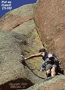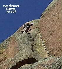 Even so, many weeks later, I was up on Casper Mountain, climbing with Pat. I was in hog heaven. Here was one of the modern masters of the area, showing me around the place. His gear was worn and derelict, by neophyte standards, but I could hold each piece in my hand and feel rope-lengths of tales. He did things to my rope that I only dreamed of in my worst nightmares, like weighting it (with an honest fall!). But you have to understand... I was new to the idea of rock climbing strictly for the sake of rock climbing. Prior to climbing with Pat, rock climbing for me had always been merely practice for the mountains. Consequently, I had spent about five years "stuck" at the 5.7/5.8 level. To climb 5.10 was something