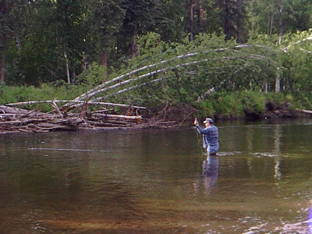 | OUR FREIND BRUCE FROM MICHIGAN, FLY FISHING ON THE CHENA RIVER BEHIND OUR HOUSE |