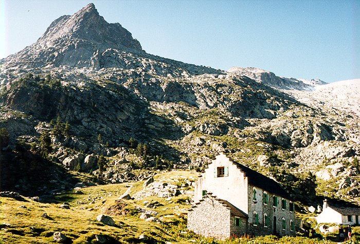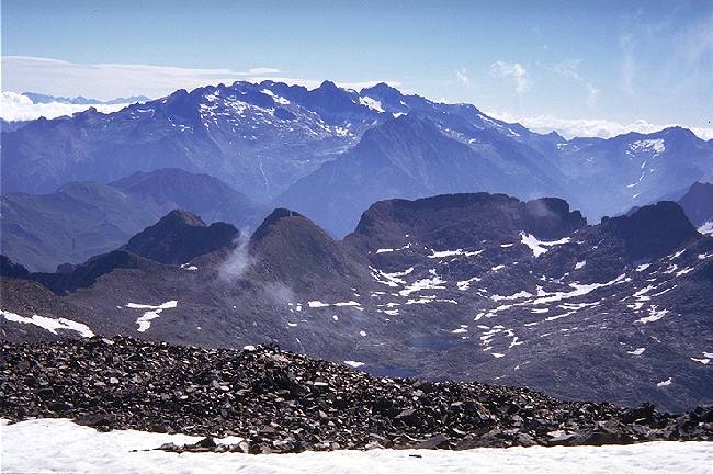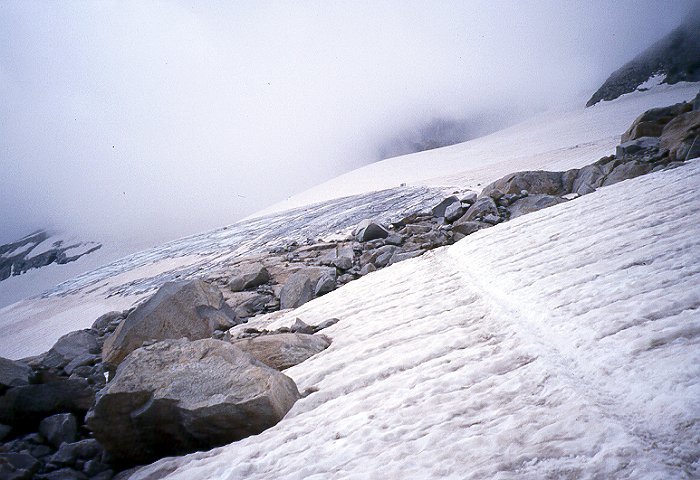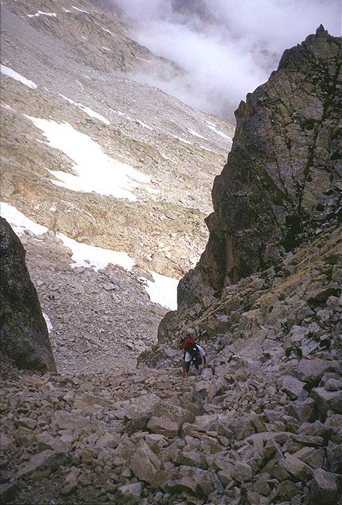 Desde Benasque, seguimos la carretera que lleva al Hospital de Benasque y continuamos hasta el Plan d´Estan, donde existe un amplio aparcamiento. Mejor llegar por la mañana muy temprano o por la tarde, si vamos a hacer noche en el Refugio de la Renclusa, pues el acceso de vehículos hasta el aparcamiento es limitado. Al terminar la carretera, no tenemos más que seguir el sendero que, sin pérdida posible, nos sitúa en el Refugio en unos 40 minutos. Es conveniente reservar plaza (Telf. 974 55 14 90 o 974 55 11 26), pues en verano suele estar atestado de gente. En cualquier caso, se puede acampar o hacer vivac en las inmediaciones. Desde el Refugio, nos dirigiremos hacia el sur, por un sendero que comienza en una zona herbosa, para pasar en seguida a otra pedregosa. Subiendo de piedra en piedra, llegaremos al Portillón Inferior, una pronunciada canal llena de piedra suelta en la que hay que poner algo de cuidado. Una vez arriba del Portillón Inferior, seguiremos por lo alto de la Cresta de los Portillones, hasta llegar al Portillón Superior, que da paso al Glaciar del Aneto. Al principio, tendremos que cruzar alguna que otra zona rocosa, por lo que no es recomendable calzarse los crampones al principio. Ya no tendremos más que subir el glaciar haciendo una cómoda diagonal hasta el Collado Coronas. A partir de aquí, la pendiente se acentúa, pero sólo restan unos 200 metros de ascensión para llegar al Puente de Mahoma, que da paso a la cumbre. Nosotros no pudimos disfrutar plenamente de la panorámica que se divisa desde el pico, pues había algo de niebla. Pero ésta levantaba algo de cuando en cuando y nos permitía disfrutar de la vista del cordal que va del Pico de Coronas hasta La Maladeta, así como del valle de Coronas, con los lagos del mismo nombre. Para la bajada recomiendo, una vez llegamos a lo alto del Portillón Inferior, no descenderlo, sino seguir por la cresta rocosa hasta el Falso Portillón, y de aquí al Refugio. Así evitaremos el riesgo de resbalar en la pedrera de la canal.