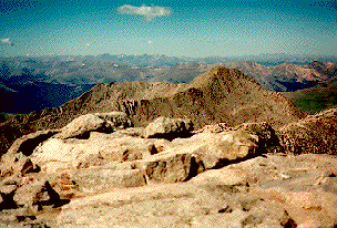 Once at the summit, you'll be inundated with people, but the view is very nice. The summit of Mt. Bierstadt is only two miles distant along the Sawtooth Ridge connecting the two mountains. Pikes Peak rises about 60 miles to the south; gazing north you'll spy Longs Peak. To the east, of course, 8,984 feet below you, lies the city of Denver. It's below that brown cloud you can see stretching into the plains.