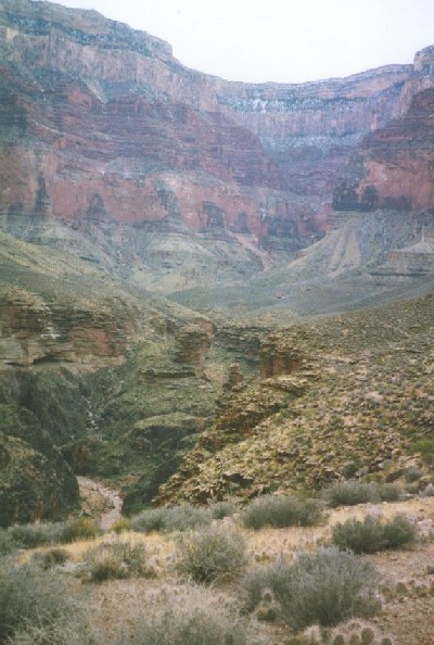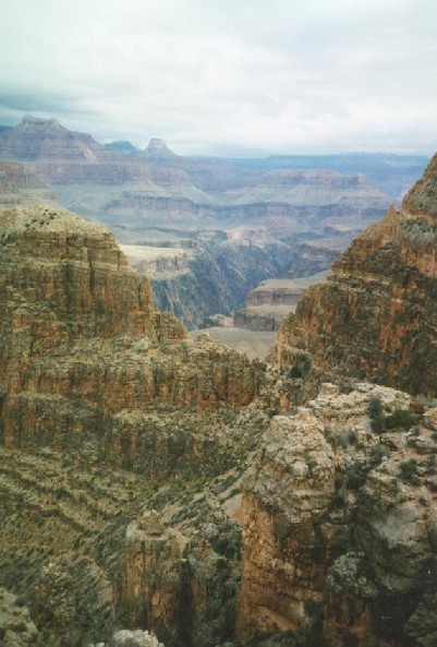 well-conditioned Russian students passed us on the trail, and Melvin decided to hurry ahead and catch up with them to ask for a ride to his car. He wanted to hurry because he still had the long drive to Utah to make. Carol and I then proceeded at a bit more leisurely pace, enjoying the incredible scenery as we continued. The sky was quite overcast all day, which of course only added to the mood and tenor of the canyon as we continued. We came to the point near Lookout Point where I had backpacked down to the previous February with five friends before deciding we weren't going to make it and turned around. I felt vindicated this time though, having in the meantime backpacked in the Grand Canyon five times since then (including Havasupai and this trip). What a year it has been! I must confess I am getting addicted to the canyon. We made our way up the rock-strewn pass and continued