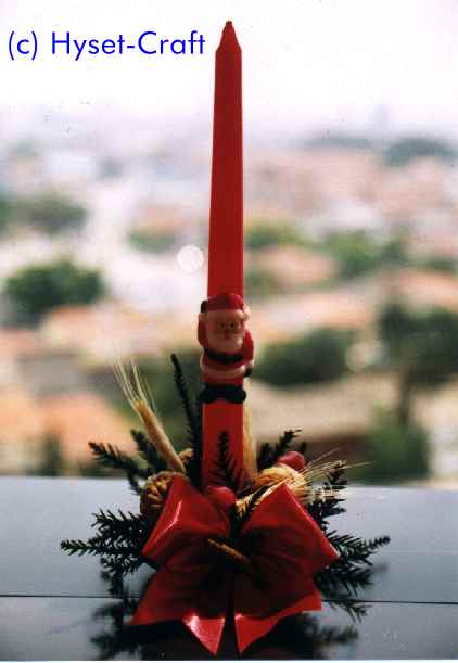 e madeira, com lacinhos vermelho ou dourado. |