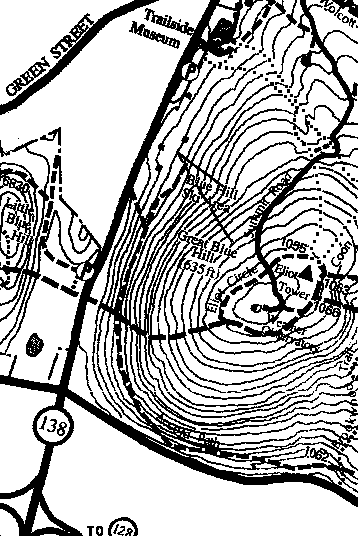 Directions to the Skyline Trail. From Rte 128, go 0.4 mi N on Rte 138. Park at commuter lot on your left. Cross street and walk back towards Rte 128 a short distance to the blue-blazed Skyline Trail. MBTA, take bus or Ashmont trolley to Mattapan. Take Hudson bus (leaves Mattapan Saturdays on the hour) to Howard Johnsons (Hillside St, almost to Rte 128). Cross street and walk back 0.2 mi to Skyline Trail.