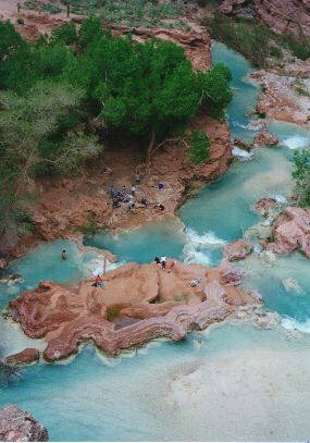 Havasupai Links | Havasupai Creek picks up its spectacular color from the calcium carbonate in the waters. These minerals are deposited as limestone travertine building up over the ages into the pools and cliff edifices. |