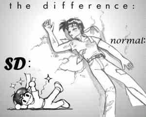 This drawing clearly illustrates the difference in style between normal anime style and Super Deformed style (SD).