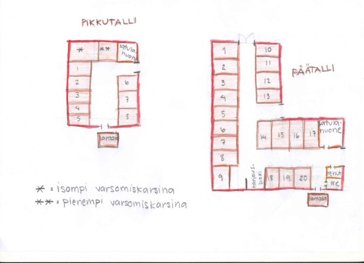 Yksityistalli Saippuakupla on pieni ratsutila maaseudulla. Suurin osa tiloista on jo 1900 - luvulla rakennettuja, mutta kunnostettuja kauniita taloja, pienen kartanon pihapiirissä. Kartano kuuluu myös meille ja majoitamme sinne kesällä myös leiriläiset. Päätalli on myös vanha, 20 - paikkainen talli, jonka olemme kunnostaneet. Täällä on myös toinen talli, pikkutalli, joka on rakennettu vastikään. Siitä löytyy 8 karsinaa. Lähes kaikki karsinat ovat 3 x 4 m (muutamat ovat pienempiä, mutta ne ovatkin varattu shettiksille/tms.) ja kaikista karsinoista löytyy juoma-automaatti, ruokakuppi sekä kalkkikivi. Tallin ympäristö on mitä mahtavin. Täältä löytyy mahtavat maastot ja pieni yksityinen uimarantakin, jossa hevosiakin sopii kesällä uittaa. Sinne on kartanolta vain reilut 100 m. Ympäristö on kaunista maaseutua ja omistamme muutaman pienen pellonkin, jolla voi rauhassa laukkailla. Laitumia on paljon, niille on kuitenkin hiukan pidempi matka kuin tarhoihin, koska laitumia käytämme vain kesällä. Tarhat ovat ihan tallin vieressä, niitä on n. 15. Meillä on kaksi kenttää ja suuri lämmitetty maneesi. Kesäisin Saippuakupla on ratsastajan paratiisi, järjestämme muutamia leirejäkin kesällä. Jos siis haluat yksityiseksi meille, katso tämä. Toiminta - linkistä löydät tietoa toiminnasta, myös leireistä lähempänä kesää. Sitä ennen on varmasti tulossa muutamia kisoja. Katso kartta tallialueesta Katso tallien pohjapiirrokset Katso lisää kuvia tallin ympäristöstä |