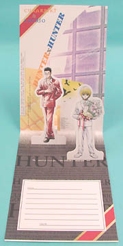 | Hunter X Hunter Pop Up Greeting Card! Curapika and Leorio A Pop-Up Greeting Card. This is the Curapika and Leorio Set. This comes with an envolope. When you open the card, You see Curpika and leorio pop up. Curapika and leorio are in casula suits, and Curapika is holding flowers^_^ aww. Still in package and in Excellent condition. Price: 3.00 Status: AVAILABLE Hunter X Hunter 500 Piece Puzzle. CoolXSweet A 500 piece puzzle set. Puzzle features Curapika and Killua. Very hard to find! Price: 25.00 Status: AVAILABLE |