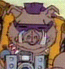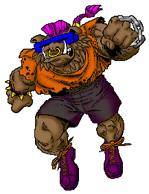 Hey, does anybody feel like hot dogs? Bebop is the mutant punk rock hog who could slam dance his way through any crowd. This roadhog warrior dares to shave his head in blatant opposition to the establishment and his parents. Behind his mohawk ponytail, cool shades and all-star tennis shoes lurks the heart of a pig, ready to pulverize the Turtles. Guided by the evil Shredder, Bebop is willing to roll in the mud to snort out the Turtles. His two turtle shoulder pads cover a grotesque array of safety pins, tattoos and junk food.