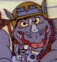 Rocksteady's fieldglasses survey the area for anything that looks like a Turtle. (He's mistakingly blasted six soccer balls). This G.I. rockhead blatantly displays his victory kills with the turtle scalps he wears around his belt.