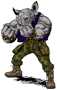 Rocksteady is one tough rhino. Rocksteady's tough rhino body makes him a turtle-bashing powerhouse. His lack of smarts makes him dangerous. This mutant mammal is big trouble with his Retro-Mutagen Gun: one shot can level a whole building or a shelled turtle. Off-duty, Rocksteady loves to fry up a mess of juicy turtle burgers for the whole hungry Foot Clan.