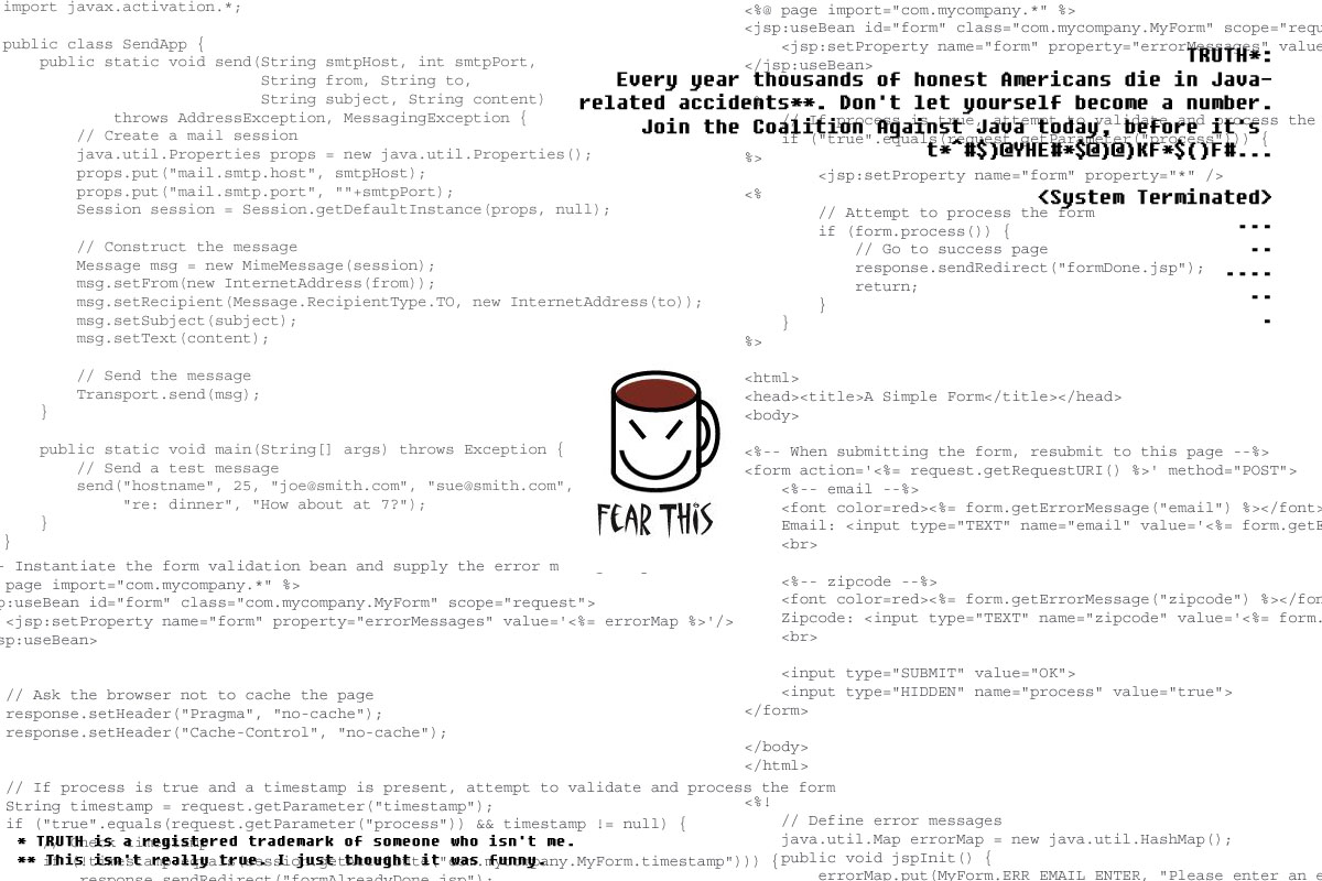 Just a little public service announcement. JAVA IS EVIL. Don't take it. EVER. On, and that image in the middle (the JavaDemon) is totally mine, I made it, I own it, and if I ever become a programmer it will be my logo so don't ruin the fun for everyone by stealing it. Thanks. 800x1200. |