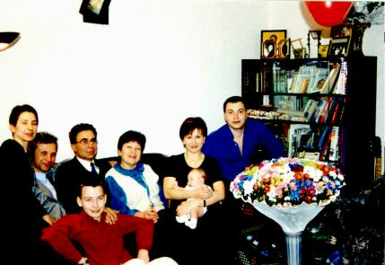 This is all our family: My aunt Olena and uncle Kolya with their son and my cousin Simon;Grandpa and grandma;My mom, dad and me, of course.Oh yeah, and a big bouqet that dad got for mom's birthday!