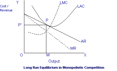 The AR curve in the long run will be more elastic, since a large number of substitutes will be available in the long run. Therefore, in the long run, equilibrium is established when firms are earning only normal profits. Now profits are normal only when AR = AC. It is further illustrated in the following diagram: