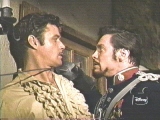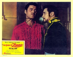 | Capitan Monastario is convinced. Believing that it is Diego de la Vega standing before him, Monastario pronounces that "Without a doubt, this man is Zorro." "You can't ask for a more positive identification than that," Diego says as he springs up from behind the bar. Horrified, Monastario pulls the mask from the man before him only to discover one of his own lancers. Knowing he has somehow been tricked, Monastario challenges Diego to a duel. Diego agrees, and the fighting commences. |