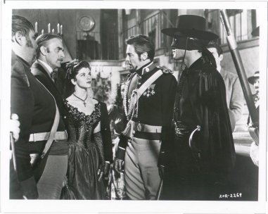 | The dinner is a pleasant affair, and the Viceroy is pleased with everything he has witnessed while in Los Angles. As he and his daughter prepare to retire to their rooms, the Commandante begs them to stay a moment longer. He has a surprise for them: he has captured the notorious outlaw, Zorro! Zorro is brought into the inn under heavy guard. With pride and a flourish, Capitan Monastario unmasks his prisoner to reveal Diego de la Vega. |