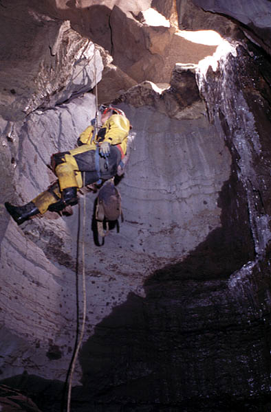 This is another view of the first drop. Here a caver ascends the 25-foot rope. Note the ice hanging from the lip of the drop. This section of the cave is very cold in winter and the ice can be found 150 feet inside the cave.