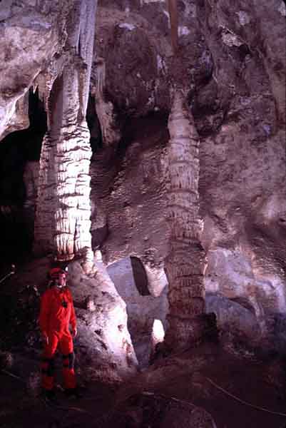 Columns and stalagmites decorate the passage on a grand scale.