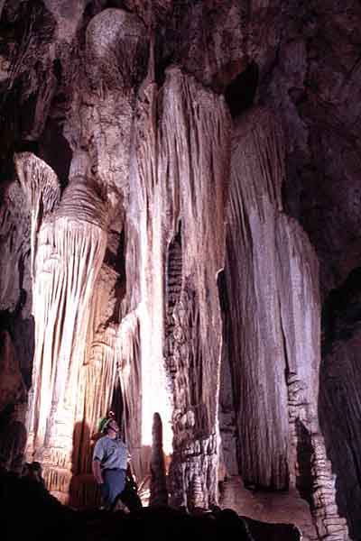 Our Forestry Service guide stands next to an incredible display of flowstone shields.