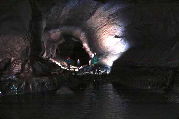 Deeper into the Overflow passage the passage becomes very large. Eventually the Overflow passage will end at a sump which is jammed full of logs (up to 40 feet in length) washed in from the surface over 2 miles away.