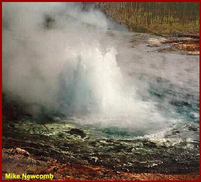 | The above picture shows the large overflow and upwelling at the start of the eruption. Note the copious water covering the entire platform and washing down the runoff channels. |