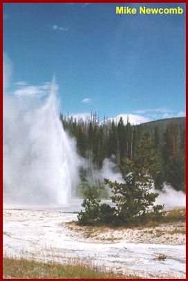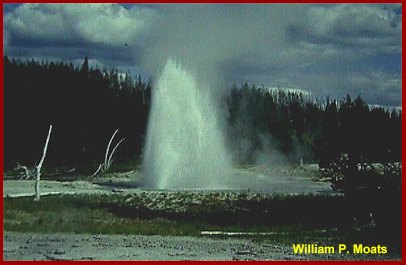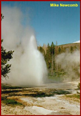 The steam to the right of Grotto Fountain Geyser is from South Grotto Fountain Geyser, part of which can just be seen at the far right of the picture. A portion of the Indicator Spring can just be seen to the left and behind the small trees in the foreground. |