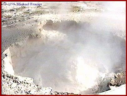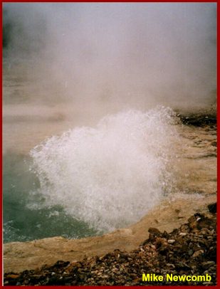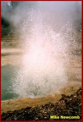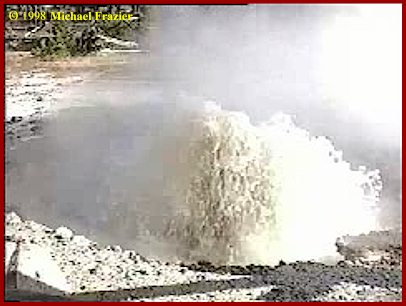 | The two pictures by Michael Frazier show Norris Pool as it looked on October 4, 1998. This was its first day of geyser activity since it had reappeared in 1995 as a mudpot. As the geyser activity continued, the crater was enlarged and the water cleared. The bottom picture shows Norris Pool pretty much as it looked two days earlier. |