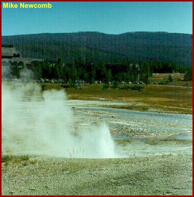 | A rare concerted eruption of Boardwalk Geyser (eruption just starting on the left) and Plate Geyser. |