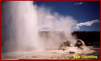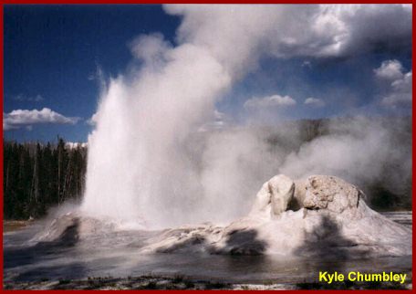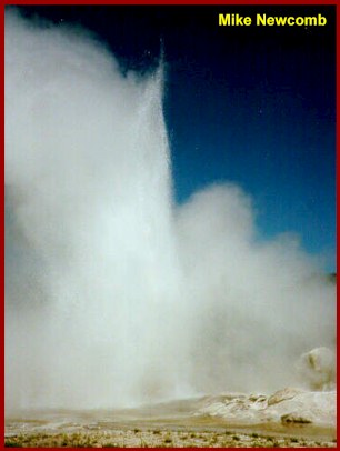 These pictures show major eruptions of Rocket Geyser. Notice Grotto's cone formation to the right of the above picture.