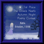 Autumn Nights Wings The perfect place for me tonight Is upon autumn nights wings Upon a billow of a moonlit cloud I journey to a far and distant place To look upon the wonder, of Earth's beautiful face I am borne through God's great creation And I am listening, as they whisper Their loving homage, in each of their vespers The jewels of autumn, glistening from the pure white snow That is cradled, in the pine trees, like a fancy lady's throw Up to the majestic, High Mountain walls The sounds of creation, the echo's recall The lonely lover's siren, riding on the autumn nights air The timber wolf is returning his lost loves despair Over mirrored waters, show's the Moon's reflected light It washes over me, Bringing contentment and delight The end of my journey, I can feel its beginnings unfold For Night is returning creation, Into mornings hands to hold Autumn night's wings replaces my feet to this Earth So that I may be a witness to the new days rebirth So, as I look to horizons new light I swear to myself, I will help Earth's dire plight For living on this Earth is a gift to man To care for it, remains in our hand Author - Katia Copyright © 1998Heaven's Fire Today I looked into this sky And it was burning black and red Heaven was on fire For the blood that spilt from his head It washed down his face like a trail of tears Bringing nothing but pain and agony And heaven burned black and red To show us its heart-wrenching misery Lightning struck out like a fist Hitting everything in sight Thunder clashed out like the voice Of the loved ones left behind The sun was hidden behind blood red skies It did not shine gladness upon the earth For together with the heavens It burned red as it shed its tears of hurt Black is for the mourning Red is for the pain Never to hear the words Of Goodbye again Author - Katia Copyright © 1998