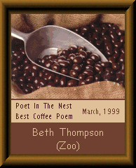 Another day dawns. I snuggle up close to your warmth, Reluctant to leave the curve of you wrapped so intimately 'round the curve of me. I open my eyes and find you looking at me, a smile of contentment and wonder(?) on your face. I sleepily smile back at you and you wrap your arms around me and pull me closer; murmuring "I love you" and planting little kisses along my shoulders, my neck...my mouth. We linger like that for awhile; relishing the comfort and security we find in each other; whispering about nothing in particular, just liking the sound of each other's voice... "Coffee?" "Yeah, Coffee." |