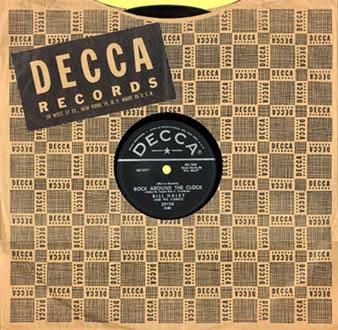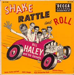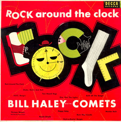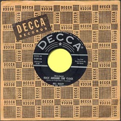 As a fourteen-year old who already loved Pop music (I had been a "Big Bands" fan during my pre-teen years), my first contact with Bill's unique brand of music was unforgettable. Every weekend, when the new edition of the "Hit Parade" would come on the radio, I was there, waiting to learn what the new ditties were. On this particular week, when the MC announced the newest Top Ten entry, "Rock Around The Clock" with Bill Haley and His Comets, I was somewhat unaware of what was comin'... And then, the blast! "ONE, TWO, THREE O'CLOCK, FOUR O'CLOCK ROCK!" .....WOW!!! What was this?! Bill's voice came through the radio speakers unbelievably loud, the beat was as solid as a heavy heartbeat and the whole rockin' arrangement sent me to Seventh Heaven! This novel composition, written by Jimmy De Knight and Max C. Freedman, as I would later learn, was definitely out of this world. I had never heard anything like it before! I was hooked... and could barely wait until the next morning to go to the local record stores with hopes of finding this particular platter. Which I eventually did! You will surely enjoy seeing the original releases in the U.S. and México of this legendary recording, on the 45 rpm single and EP formats: