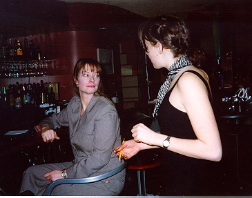 "has your party arrived yet?" the restaurant hostess (elise molinelli) asks wendy (linda hetrick) at the bar. . the NYC metro area and some down by the shore in the suburbs (including the one i was born in, monmouth medical center in long branch), but they all turned me down. at least 15 different places. finally, i contacted brian grace at the newton memorial hospital in newton, NJ. newton is a small town in north western jersey that is surrounded by farmland -- a very nice place.while still negotiating with the hospital, i made the decision to go back to the restaurant. unfortunately, one of the scenes we shot there (the 'bar scene') ended up being completely out of focus and we really needed to re-shoot it. and since i also wasn't that happy with how the 'pay phone' scene turned out either, we went back to re-do it. so we went back on a tuesday night in early february at 10pm and shot until about midnight. this time, both scenes turned out much better! |