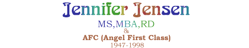 That's right...I am alive and well in cyberspace. But why? Well, for starters, did you notice those dates up there? 1947 to 1998...what a limiting concept. I had to put the kabosh on that idea. Like time and space can define someone. Ridiculous. And I'm back because Heaven, it turns out, was just a little too dull and boring for me. You know, hanging out all day, catching rays, margarita in hand... It's a health food up there! Talk about Upside Down Nutrition! (That's one of my published articles which, by the way, you can also find by visiting Jennifer's Picnic Basket, under Nutrition Power Headquarters.) Not to mention that up here (by the way, Heaven isn't "up" anywhere; that's just how you think of it), THEY want you to wear these god-awful (no diss pun intended there, BIG GUY) bulky angel wings. Angel First Class, si... Wings made of feathers (ha-choo), no! And wear one of those round halo things on my delicately coifed hair? Sorry, I'd been having a bad enough hair day as it was. But most importantly, I'm back because I got a hankering for some quality time with my earthbound friends. And you're all my friends, you know that, don't you? So I volunteered (as in, twisting Gabriel's wing) to parasail on down for this special assignment. You've gotta be pro-active, can't let THEM boss you around. Like I used to tell you, my beloved readers and clients, make sure your medical team knows that you are the boss in your own recovery. They're just advisors. (You should've seen the look on Gabriel's face when I told THEM that. He looked like he'd seen a ghost!) [By the way, if you don't know who in Heaven's name I am, where I came from or what I'm talking about, just hang out here for a while. HINT: In my previous incarnation I was a specialist in nutrition for people with HIV/AIDS, and to a lesser degree, cancer and other serious medical conditions. Visit some of the other pages on this site and you'll get the gist.] So, here's the deal. I just love writing for you guys! I can't let a little thing like physical death get in the way. Problem is, it's a little hard to type without those handy little fingers you all have. Not having a body anymore can be a bit of a drawback. So I'm having to rely on the nimble fingers of my beloved husband, Ken. (Not the first time, I might add!) Anyway, for starters, we've put up a representative sample of my previously published articles so you can access some of the information I've already put out there in that old-fashioned, but tried-and-true, print media. And if you have questions, there is a Virtual Faculty to answer them for you, because, as you might expect, I'm not going to be available "on demand" for answers. (The deal I made with THE FOLKS UPSTAIRS only allows me to visit cyber land once in a while. Just exactly how long is an eon, anyway?) The Virtual Faculty is made up of colleagues of mine, who do have fingers to type with by the way, experts in HIV nutrition who have volunteered out of the largesse of their respective hearts to respond to your questions. And there's a few other goodies on this site. Like the beautiful tributes some of you said and wrote about me after my bodily demise. You really touched my heart. But it's not all tears here. There's some amusing pix, for instance, on the Curriculum Vitae and Then Some page, and a whole bunch of funny, sad, and educational stuff scattered here, there, and everywhere. And there's a Guestbook to let me know you've been here. I'll be making a list and checking it twice, so sign in! Then as time (weird concept, that finite "time" thing) goes on, we may discover other things to put on this site and other ways to interact with you. It's a work in progress. Like, as it turns out, everything! I hope you enjoy this site. I'm doing this 'cause I love you! And I'm doing this 'cause you love me too! You see, from my vantage point, I can see a lot now. I can see that LOVE really does make the world go 'round, for one thing. And it also makes cyberspace turn in on itself, round and round, like a Mobius strip, like a double helix, like a couple of lovers twirling on the dance floor to the music of the spheres... forever...and ever...and ever...and ever.........