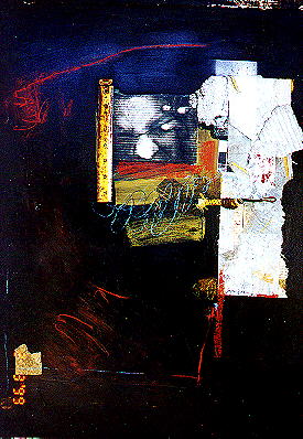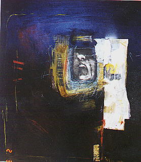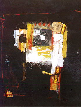 The Faces series is about my emotions and inner turmoil. Recently, I have been faced with many challenges in my life, much as we all are at times. During the last few years I have been watching my two teen-aged daughters deal with the problems of growing up in the 1990s, which, surprisingly, are much like the problems I experienced growing up in the 1960s. Yet the world has changed, and therefore my reactions to their problems are different than the choices I made three decades earlier. At times, I get frustrated with the complexity of the modern world, and I feel that I cannot offer them the same solutions I relied on growing up. I feel trapped, with no way to ease their minds. The faces in these works reflect my frustrations and my longing to escape my trap, and the pieces of rope, words and photo transfers represent my need to escape... -Joyce Hill, 1999
