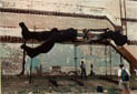 'Swimmer', The 30' wind activated swimmer sculpture was constructed in the abandoned Lawrence Paint and Varnish building, Pittsburgh, April 1993 - April 1994. With the involvement of eight people, the figure was created over the course of a year on the sixth floor of the neglected landmark. Using found metal and wood, the piece was constructed and suspended from the rafters, in a way that allowed its arms and legs to move. The Swimmer was discovered and cut down by the property owners, until being recovered and taken to safer location, the Aliquippa Community Arts Festival in August of 1994. The sculpture was exhibited until being condemned by a local planning authority the following year.