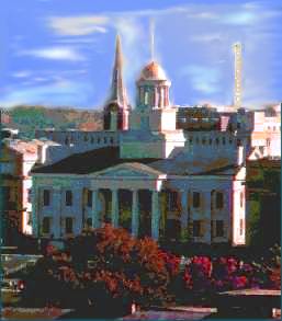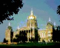 Today, the Mesquaki (Fox) Settlement is an area of land around Tama in central Iowa that's governed and owned communally be descendants of the two tribes. The area is not a reservation; the land was purchased back from the government in 1856. Early State Government After white settlement began with the Black Hawk Purchase, Iowa became part of Michigan Territory. When Michigan achieved statehood in 1836, Iowa then became a part of Wisconsin Territory. Finally, two years later, Iowa Territory was carved out of the area of Wisconsin Territory west of the Mississippi River. The first Iowa Territory legislature met in Burlington before a territorial capital city was finally selected in Johnson County. In Iowa City, the government seat was established in a grand structure known today as Old Capital. Built in the early 1940's, Old Capital served as the last capital of Iowa Territory and the first capital of the state. This building serves as a "centerpiece" to the campus of the University of Iowa. Under the 1857 Iowa constitution, the seat of state government was moved to Des Moines, a more central location. Here is a picture of the capital in Des Moines (left) The Governor of Iowa lives in "Terrace Hill" (right) FUN FACTS Education Iowa educated youth have led the nation in SAT and ACT scores for the past two decades. Iowa has three state universities, 62 public and private colleges and 15 community colleges on 28 campuses. Geography and Climate Iowa is centrally located in the heart of North America, a welcoming place to stop and visit. With the Missouri River on the western boundary and the Mississippi River on the east, Iowa is the only state bordered by two navigable rivers. Iowa's four distinct seasons provide a wide range of temperature variation through the year - a perfect place to celebrate summertime sunshine and winter wonders. Industry The largest source of personal income for Iowans is manufacturing, followed by services, retail/wholesale trade and government. 24% of America's pork and 4% of the nation's grained beef are raised in Iowa. Iowa ranks #1 in the nation in grain harvested. Agriculture Producing food, fuel, clothing, and medicine for the world, agriculture is a leading industry in Iowa, a state with more than 100,000 farms. One Iowa farm family grows enough food and fiber to feed 279 people, one fourth of whom live overseas. In the United States, Iowa ranks: first in beef and pork production, first in corn production, first in soybean pro duction, first in grain production. Population The 1994 estimated population of Iowa is 2,830,000. Iowa ranks 30th in population and 23rd in land area. Statehood Iowa became the 29th state on December 28, 1846. Nickname - The Hawkeye State The nickname was adopted early in the state's history. Two Iowa promoters from Burlington are believed to have popularized the name which quite probably came from the great Indian chief Blackhawk. State Tree - Oak The oak was designated as the official state tree in 1961. The Iowa General Assembly chose the oak because it is abundant in the state and serves as shelter, food, and nesting cover for many animals and birds. It is difficult to find a tract of natural woodland in Iowa that does not have in it at least one species of oak. No other group of trees is more important to people and wildlife. Acorns, the nuts of oak trees, are a dietary staple of many animals and birds. Deer, wild turkeys, pheasants, quail, wood ducks, raccoons, squirrels, chipmunks, bluejays, nuthatches, grackles, and several kinds of woodpeckers are a few of the species that depend on acorns for a significant portion of their diet. State Rock - Geode The Iowa General Assembly designated the geode as the official state rock in 1967. Because Iowa is well known of the presence of the geode, it was chosen as the official rock in an effort to promote tourism in the state. Legislators who favored making the geode the state rock pointed out that it is among the rarest and most beautiful of rocks and that Iowa in known worldwide because of the large number found in the state. Other rocks considered for official status were limestone and fossil coral. In Latin, the word geode means earth like. Geodes are shaped like the earth and average about 4 inches in diameter. Geodes are found in limestone formations and have a hard outer shell. When carefully broken open, a sparkling lining of mineral crystals, most often quartz and calcite, is revealed. Geologists attribute the crystal growth to the percolation of groundwater in the geologic past. Southeastern Iowa is one of the state's best geode collecting areas. Geode State Park in Henry County is named for the occurrence of the geode. State Flag and Motto Iowa was almost 75 years old before the state flag was adopted by the General Assembly. Creation of the state flag had been suggested for years by patriotic organizations, but no action was taken until World War I, when Iowa National Guardsmen stationed along the Mexican border suggested a state flag was needed to designate their unit. This prompted the state's Daughter's of the American Revolution (DAR) to design a flag in 1917. The Iowa General Assembly officially adopted the design in 1921. The state flag consists of 3 vertical stripes - blue, white, and red. The blue stands for loyalty, justice, and truth; the white for purity, and the red for courage. On the white center strip is and eagle carrying in its beak blue streamers inscribed with the state motto: "Our liberties we prize, and our rights we will maintain." The word "Iowa" is in red just below the streamers. All schools must fly the state flag on school days. The flag may also be flown on the sites of public buildings. When displayed with the Untied States flag, the state flag must be flown below the national emblem. State Bird - American Goldfinch The Iowa General Assembly designated the American Goldfinch, also known as the eastern goldfinch and the wild canary, of the official 